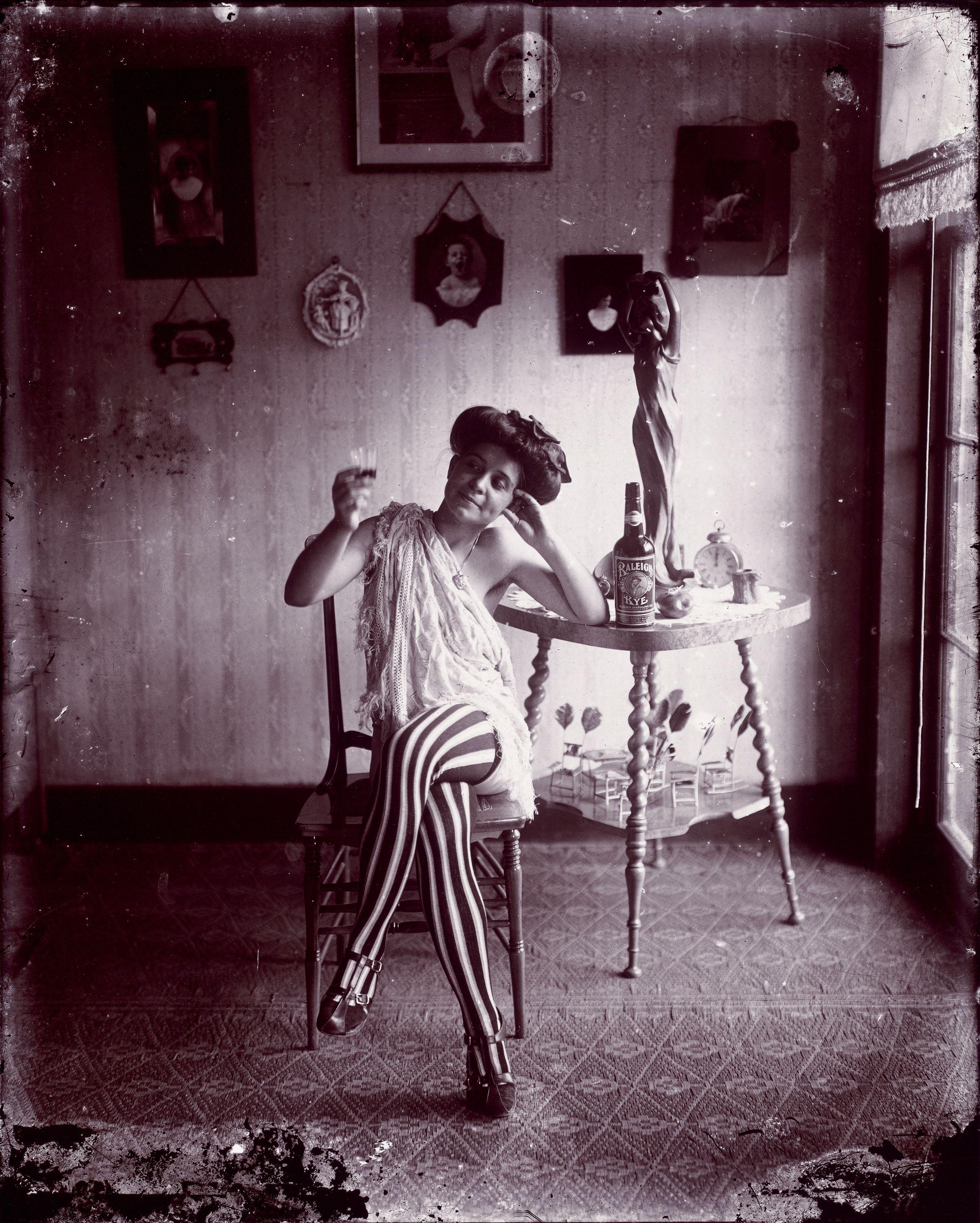 Sometimes viewers miss the prominent bottle of whiskey with label facing forward and statue mimicking the swirling fabric draped on the woman because of her striking stockings and mischievous grin. Raleigh Rye was the favored whiskey of the time, according to some sources. Some have speculated that this was a commercial photo for Raleigh Rye.1 But descriptions almost always omit the army of feathered rocking chairs on the bottom of the table.